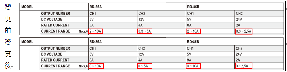 自2019年06月04日生產(chǎn) (工令: Y1906D)之標準品(詳細請參見(jiàn)下方表格)即導入升級后新版本。本次變更所增加之成本保持由明緯自行吸收,售價(jià)將不會(huì )調整,若您對本次產(chǎn)品變更有任何疑問(wèn),請參閱明緯官網(wǎng)較新公告的規格書(shū),或請您與明緯業(yè)務(wù)代表聯(lián)系。