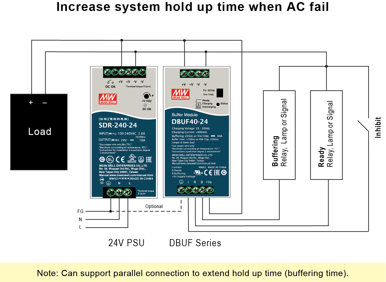 明緯新推出了軌道式20A/40A備援緩沖模塊DBUF20/40系列,可搭配DIN rail電源供應器為負載的短暫備援,當AC市電短暫停電或瞬斷時(shí)DBUF20/40將會(huì )啟動(dòng)緩沖功能提供穩定24保持系統運行,緩沖時(shí)間長(cháng)短則依據負載電流而定,DBUF20在20A條件下可緩沖350ms,DBUF40在40A條件下可緩沖250ms。