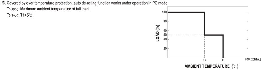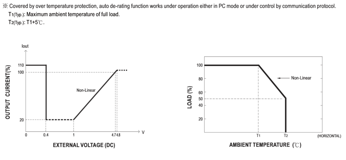 傳導散熱電源UHP系列為明緯新一代工控電源產(chǎn)品,獨特無(wú)風(fēng)扇設計自推出市場(chǎng)后頗受好評。UHP系列1000W以上產(chǎn)品(UHP-1000/1500/2500和PHP-3500)具備一大特色為可程序電流功能(Programmable Current, PC),透過(guò)外加直流電壓1~5V控制輸出電流20%~100%。PC功能其中一種使用情境為充電應用,客戶(hù)使用此功能搭配設備的電池管理系統(Battery Management System, BMS)即可對電池做充電管理。充電過(guò)程中往往會(huì )導致環(huán)溫隨之升高,過(guò)去電源供應器過(guò)溫保護機制為關(guān)斷輸出,待溫度降低后自動(dòng)恢復輸出狀態(tài)。本次產(chǎn)品升級于PC功能下增加過(guò)溫自動(dòng)降載功能,可有效避免溫度上升過(guò)快來(lái)不及關(guān)閉電源所造成組件損壞問(wèn)題,并且于溫度稍高情況下提供一較小的充電電流保持充電穩定性。圖一為UHP-1000規格書(shū)針對此功能新增之負載曲線(xiàn)圖,電源在PC模式和滿(mǎn)載條件下,超過(guò)較大環(huán)溫值將降載至50%,若溫度仍持續上升即關(guān)閉輸出,待溫度降低后再次啟動(dòng)。圖二為UHP-1500/2500和PHP-3500的負載曲線(xiàn)圖,與UHP-1000略有差異的地方,其一是除了于PC操作下會(huì )動(dòng)作外,通訊功能下亦會(huì )啟動(dòng)此功能,其二是T1到T2升溫過(guò)程中每升高1℃,負載約降10%。