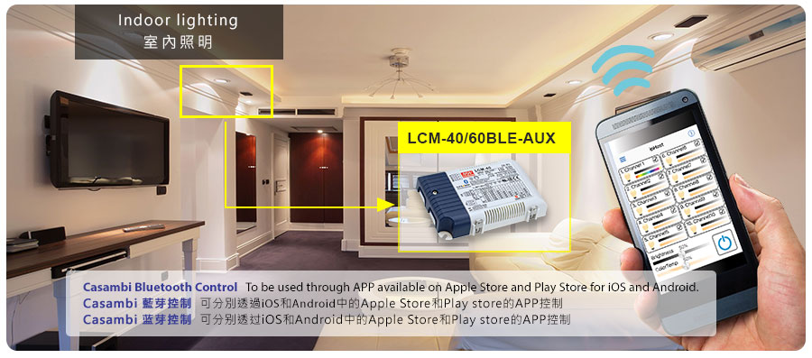 讓照明變得智能化、方便化將是LED照明產(chǎn)業(yè)的發(fā)展趨勢,明緯針對室內照明電源,開(kāi)發(fā)可搭配藍芽連網(wǎng)(Mesh)控制的LED電源LCM-40/60-BLE,讓使用者可以透過(guò)一般的手機或平板計算機就可以達到智能化的照明控制。