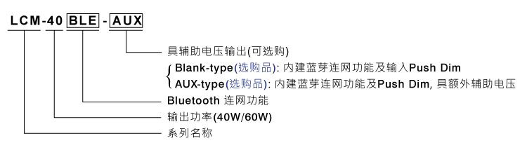 - 調光功能: 藍芽控制及輸入端 (Push Dim.)