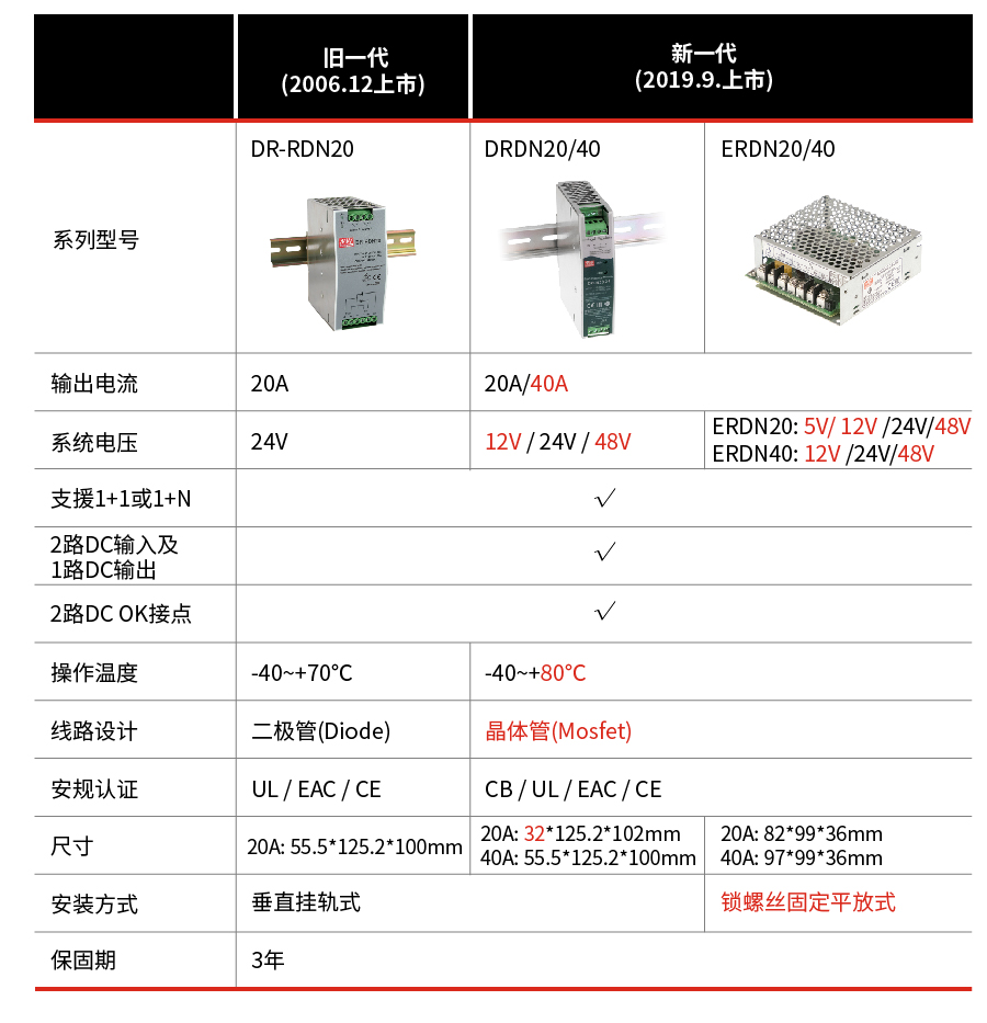 明緯軌道式DR-RDN20電源供應器冗余模塊已銷(xiāo)售13年之久,由于尺寸偏大、內部線(xiàn)路采二極管設計精準度性能需提升,因此明緯新開(kāi)發(fā)了次世代軌道型可快速掛軌的DRDN20/40系列,并同時(shí)規劃了采鎖螺絲固定的機殼型ERDN20/40系列,新舊世代詳細差異如下表。