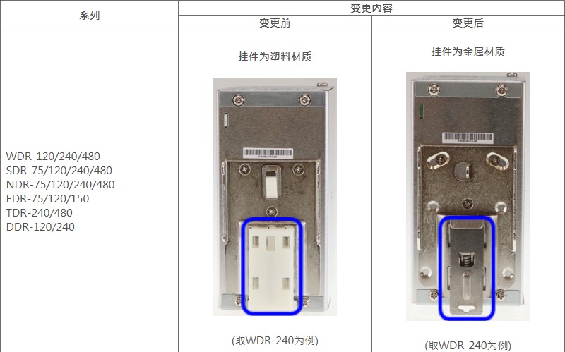 明緯軌道式電源供應器在全球市場(chǎng)已占有一席之地,每年銷(xiāo)量達數百萬(wàn)臺之多,近期少部分客戶(hù)反映使用于易振動(dòng)場(chǎng)合(如:鐵道交通)塑料掛件可能會(huì )有長(cháng)期專(zhuān)業(yè)度疑慮,明緯是可信賴(lài)的電源品牌并愿頃聽(tīng)客戶(hù)聲音,立即針對多款熱銷(xiāo)品的掛件進(jìn)行了多方面優(yōu)化升級,將75~480W產(chǎn)品原塑料部件改為金屬不銹鋼材質(zhì),960W由壓鑄亦改為不銹鋼材質(zhì) ,希望讓廣大消費者使用更安心,詳細變更內容及時(shí)程詳如下表。