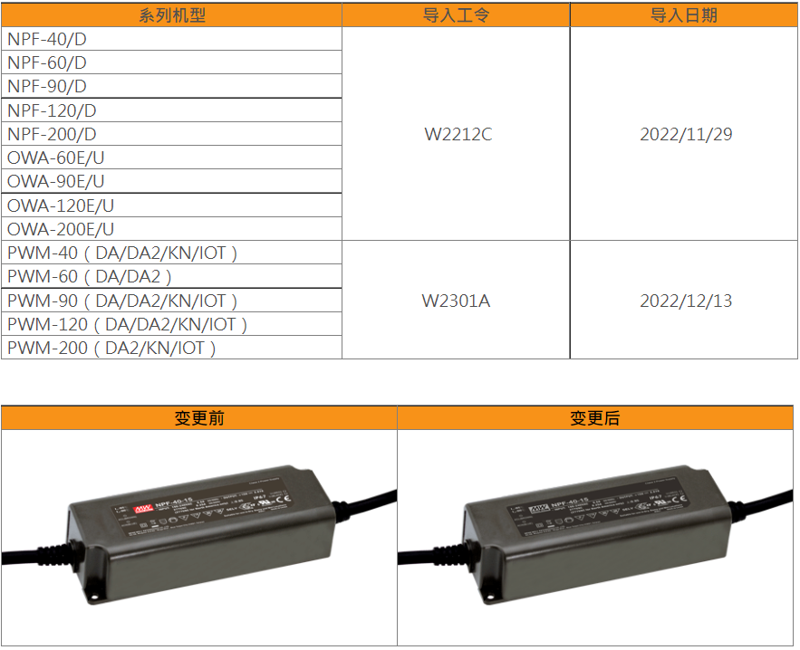 為響應更環(huán)保的生產(chǎn)制造方式,及提高自動(dòng)化生產(chǎn)率,明緯將相關(guān)LED電源塑料殼類(lèi)機型,由傳統貼卷標標示,改成雷射雕刻方式,以減少塑料化合物的使用,并降低人工操作的誤差,持續改善生產(chǎn)流程與降低對環(huán)境的沖擊,為我們的環(huán)境盡一份心力。此次,相關(guān)導入雷射雕刻卷標系列機型如下表說(shuō)明,若您對此變更有任何應用上的問(wèn)題,請立即與明緯的業(yè)務(wù)代表聯(lián)系。