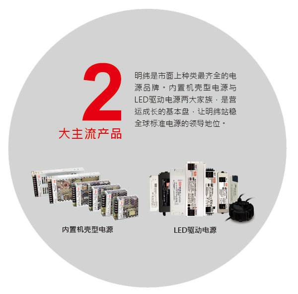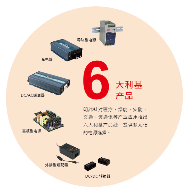 明緯秉持著(zhù)持續創(chuàng )新的精神,每年新增10%新品,至今提供全方位之電源供應器產(chǎn)品,瓦特數涵蓋 0.5W~25,600W,主要產(chǎn)品類(lèi)別有 AC/DC 電源供應器、LED驅動(dòng)電源、AC/DC 充電器、DC / DC轉換器和DC / AC 逆變器,提供廣泛產(chǎn)品類(lèi)別以滿(mǎn)足不同產(chǎn)業(yè)客戶(hù)之應用需求。